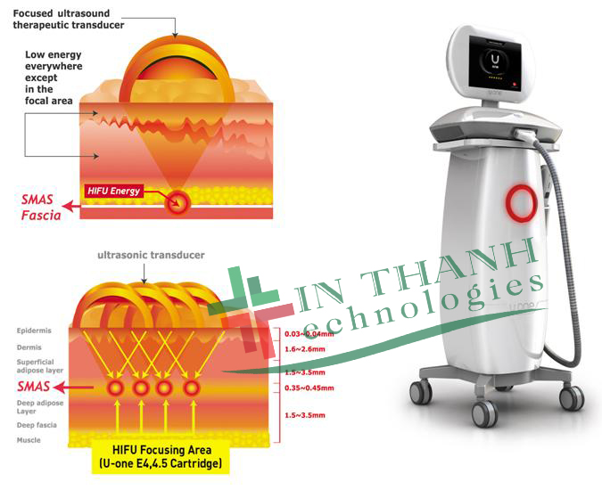 - Máy trẻ hóa da HIFU U-ONE sử dụng công nghệ Sóng siêu âm hội tụ năng lượng cao (HIFU) xuyên sâu đến các lớp biểu bì (1,5 mm), hạ bì (3,0 mm), SMAS (4,5 mm) mỡ.Các điểm năng lượng tập trung tại lớp SMAS có mức nhiệt từ 60 đến 80 độ C đem lại tác dụng tái sinh collagen, elastin và sắp xếp lại các tế bào giúp nâng cơ, săn chắc, làm trắng, mang đến một làn da trẻ trung hoàn hảo.